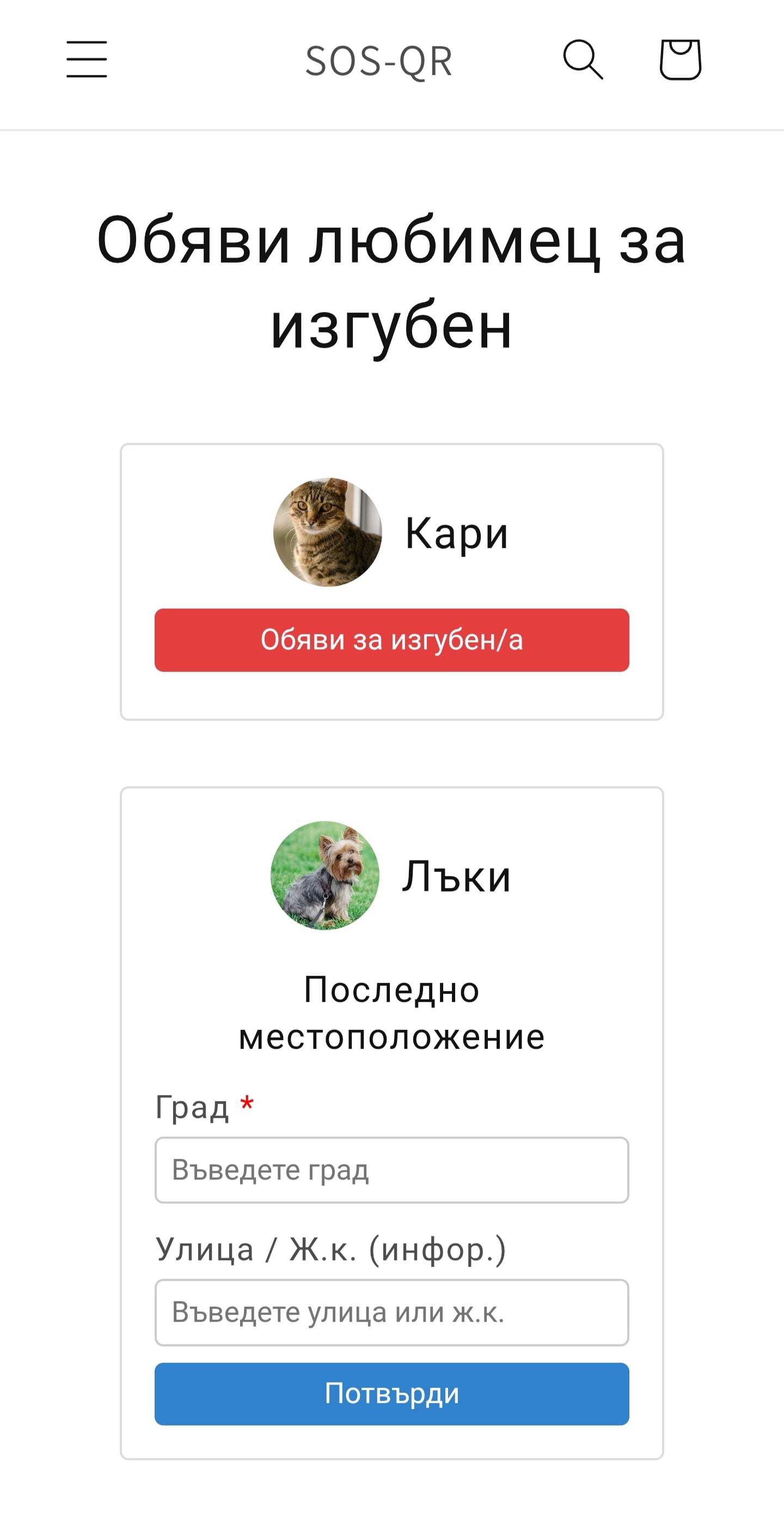 Всички потребители на SOS QR в града в който го обявиш за изгубен ще получат известие с профила му и последното местоположение