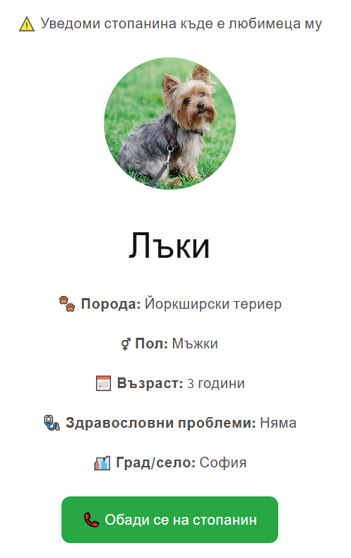 🔍 Опция за обявяване на домашен любимец за изчезнал - Изпраща известие до всички други потребители в града, в който си го обявил за изгубен.