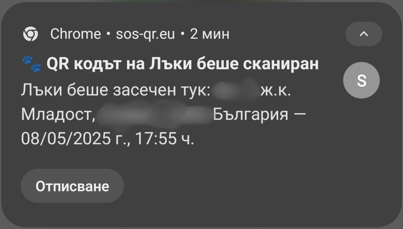 🔔 Получаваш известие и имейл - Когато някой сканира QR кода на твоя любимец, веднага получаваш известие и имейл с местоположението на сканиране.